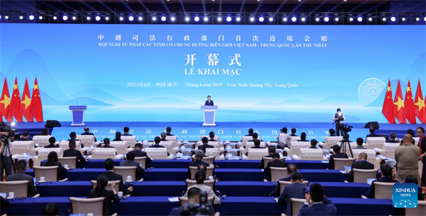 This photo taken on June 28, 2025 shows the opening ceremony of a border meeting held by Judicial administrative authorities from China and Vietnam, in Nanning, south China's Guangxi Zhuang Autonomous Region. Judicial administrative authorities from China and Vietnam held a border meeting from Saturday to Sunday in Nanning, capital of south China's Guangxi Zhuang Autonomous Region, to enhance cooperation. The meeting, the first of its kind, brought together nearly 150 participants from both countries, including officials from the justice departments, local judicial administrative organs, and legal professions. [Photo/Xinhua]